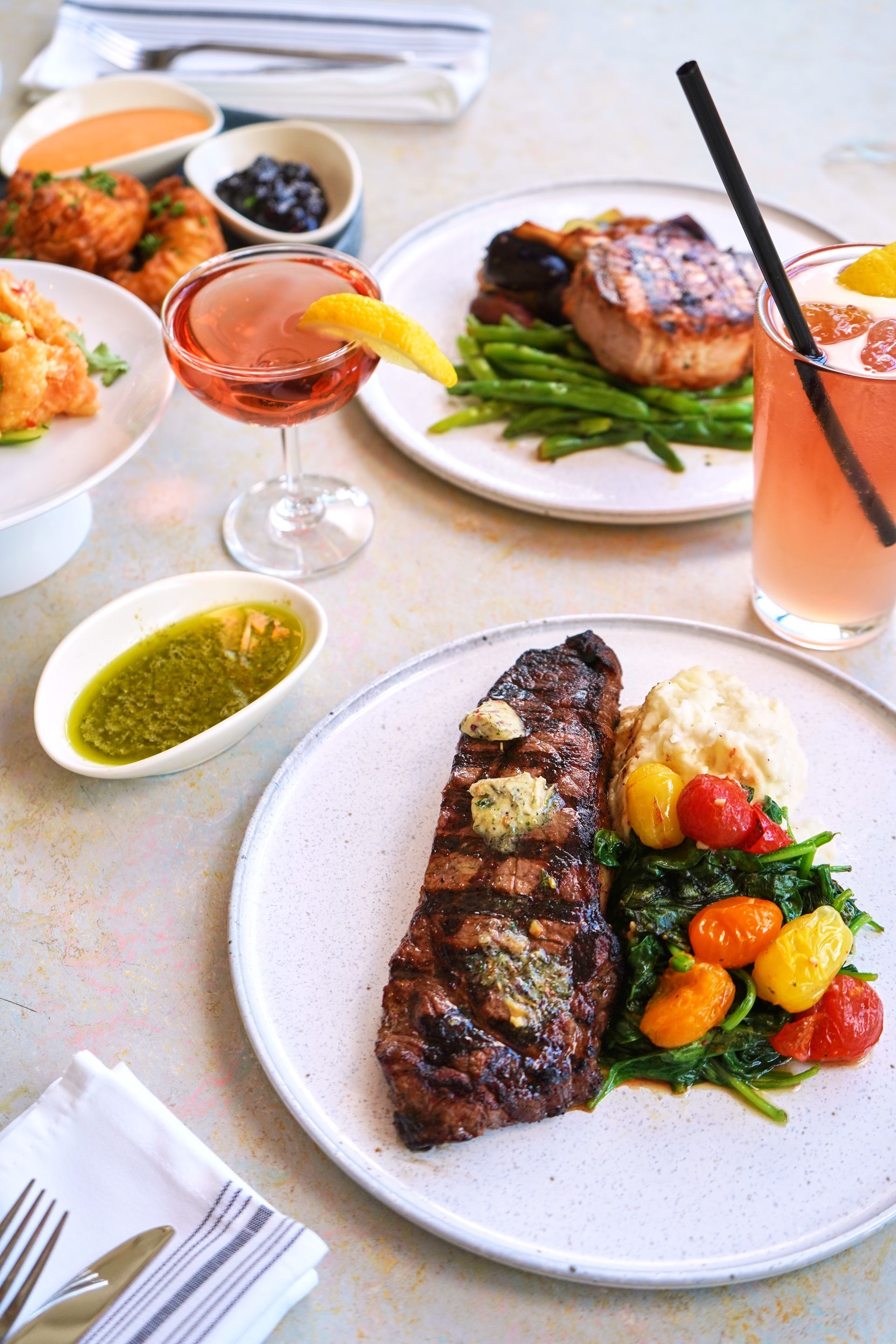 Sauteed Spinach, Blistered Tomatoes, Garlic Mashed Potatoes, Herb Butter